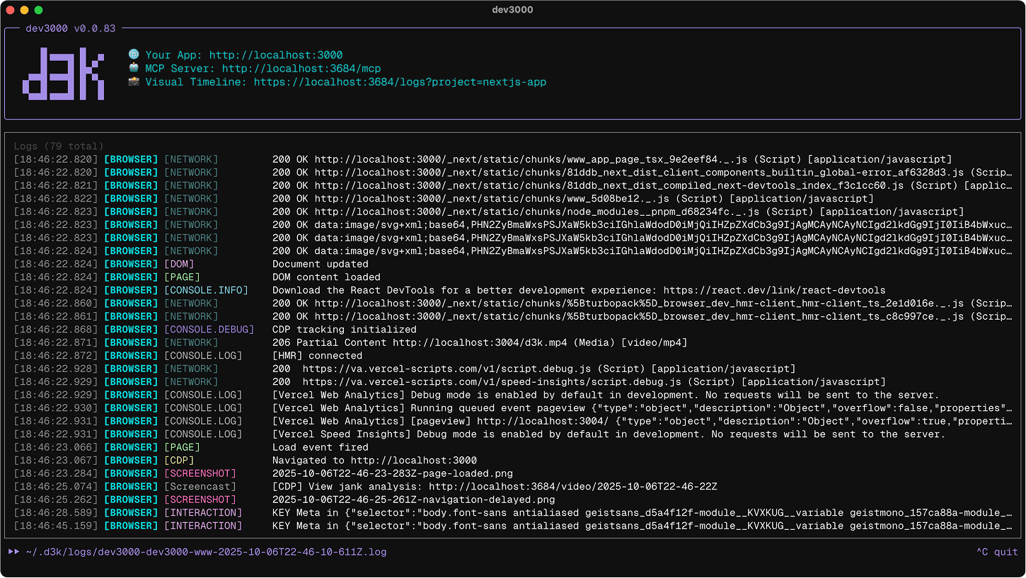 # Instead of running bun run devd3k # or dev3000# Setting a portd3k -p 5000# Custom scriptd3k -s build-startInteract with your app in the monitored browser. Every log, request, error & page state is captured automatically.